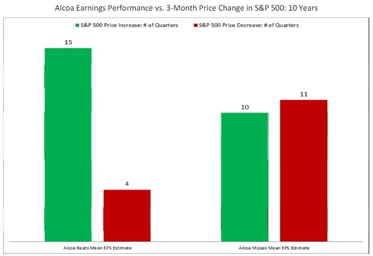 En general, si Alcoa bate las estimaciones, el S&P500 se comportará bien, con un 80% de probabilidades (datos de 2003 a 2013), mientras que si Alcoa no supera las estimaciones, tal y como ha ocurrido en este cuarto, esas probabilidades bajan al 50%.