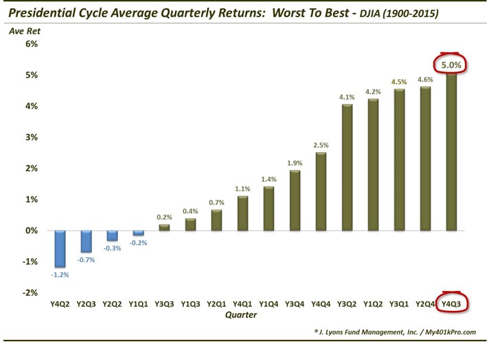 Se trata de los rendimientos históricos trimestrales del índice Dow Jones desde 1900, según el ciclo presidencial (del año 1 al año 4).