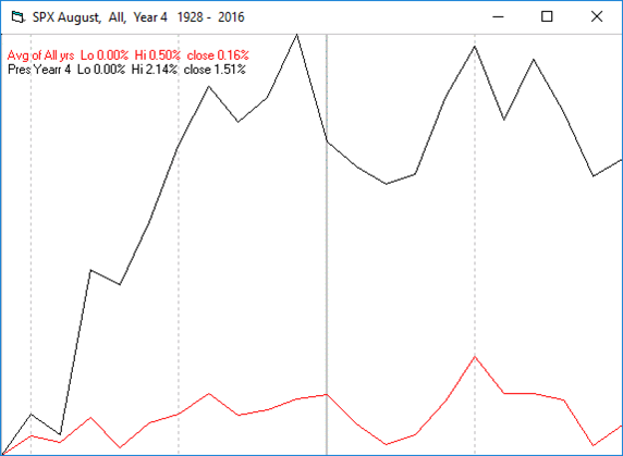 En la siguiente imagen observamos la media del S&P500 durante el año electoral, siendo el mes de Agosto el mejor mes del año.