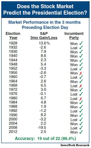 Si nos atenemos a los movimiento históricos previos del mercado (S&P500) en todas las elecciones anteriores (desde 1928), actualmente habría un 86.4% de probabilidades de que Trump sea el próximo Presidente de los Estados Unidos.