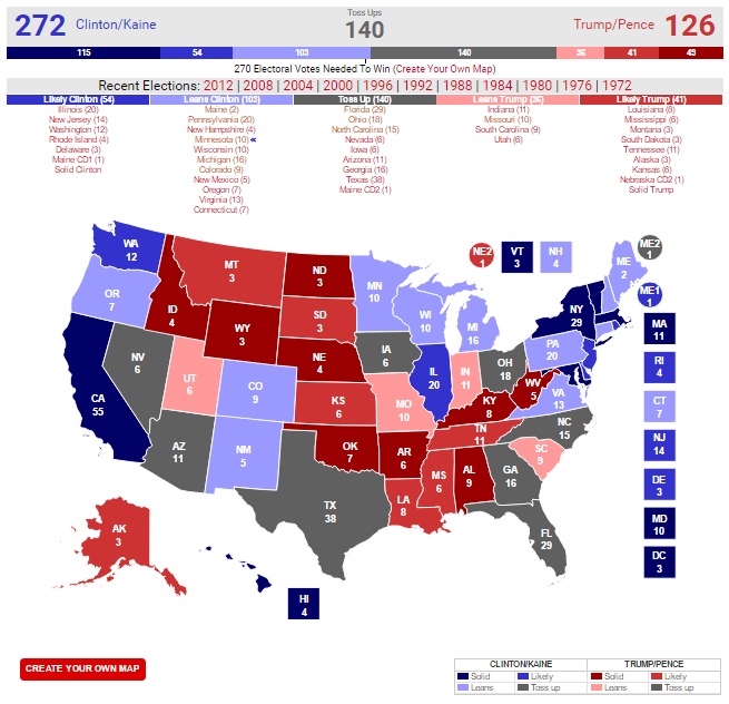 A falta de sólo una semana para las elecciones más importantes de la Tierra, las últimas encuestas son favorables a la Sra. Clinton, tal y como vemos en la siguiente imagen: