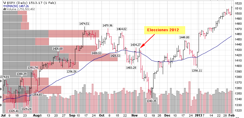 Y para terminar, como curiosidad, veamos gráficamente lo que ocurrió en las elecciones del 2012 (6 de noviembre), en las que Obama fue reelegido.