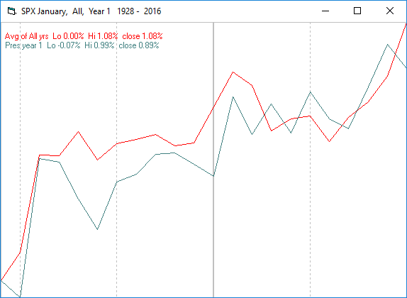 Si consideramos únicamente el año 1 del ciclo presidencial, los "eneros" son más débiles, con un rendimiento medio del +0.8% y un 59% de meses alcistas.