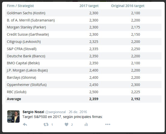 Si consideramos el precio objetivo medio obtenido por las principales firmas (2.359), nos sitúan al S&P500 para final de año en un +5.40% (justo en la media propia del año Trump).