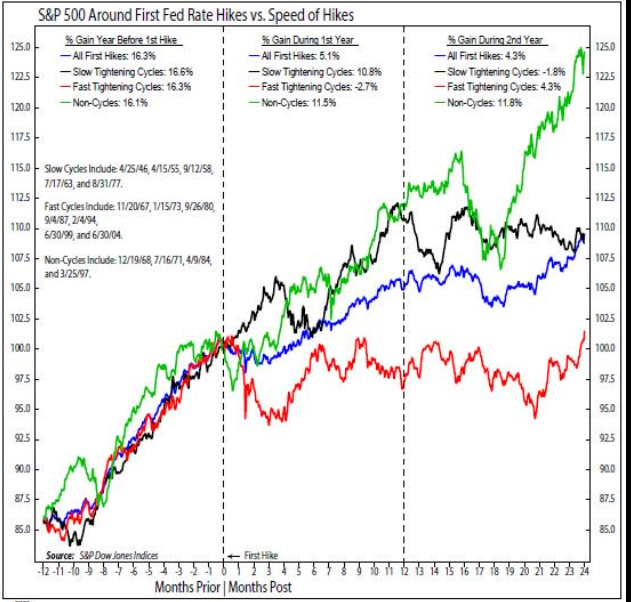 En mayo de 2015, veíamos en el post "Velocidad de Subida de Tipos: Clave en los Mercados" cuáles habían sido los movimientos históricos del S&P500 según el tipo de ciclo de subidas.