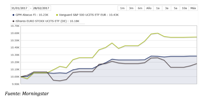 GPM ABACUS ha cerrado febrero con un valor liquidativo de 8.412, lo que nos da una rentabilidad neta del +2.83%, vs. +5.50% del S&P500(€) o del +2.75% del EuroStoxx50: