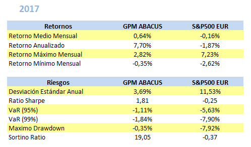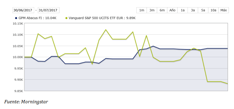 En la siguiente imagen observamos la evolución mensual de GPM ABACUS (línea azul) (+0.60%) vs. el S&P500 (€) (-1.20%).