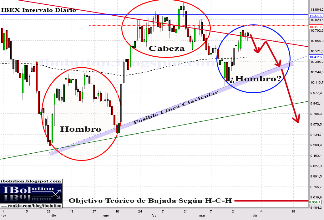 Ayer mismo, tenía dándole vueltas al tema de las Formaciones Chartistas (que por coherencia debería ser el siguiente tema) pensando si me animaba o lo postergaba y al mismo tiempo estaba realizando un análisis del IBEX para mi otro Blog cuando me topé precisamente con lo que podría ser (si hay correcciones y se confirma) un Hombro-Cabeza-Hombro en el IBEX.
