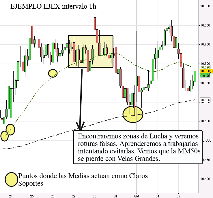 La MM50s seguirá al mercado de cerca, pero manteniendo su distancia, sobretodo si la tendencia del mercado es clara y bien definida. En ocasiones, el precio abandonará ésa tendencia e irá a apoyarse o probar la MM50s. Los puntos de apoyo sobre la MM50s serán más frecuentes que los de la MM200s, pero mucho menos frecuente que los de la MM20s. Por otro lado, podemos pelearnos bastante con ella en momentos de duda. La Pérdidao Superación de la MM50s es un argumento bastante importante que conviene tenerlo presente a la hora de tomar decisiones.