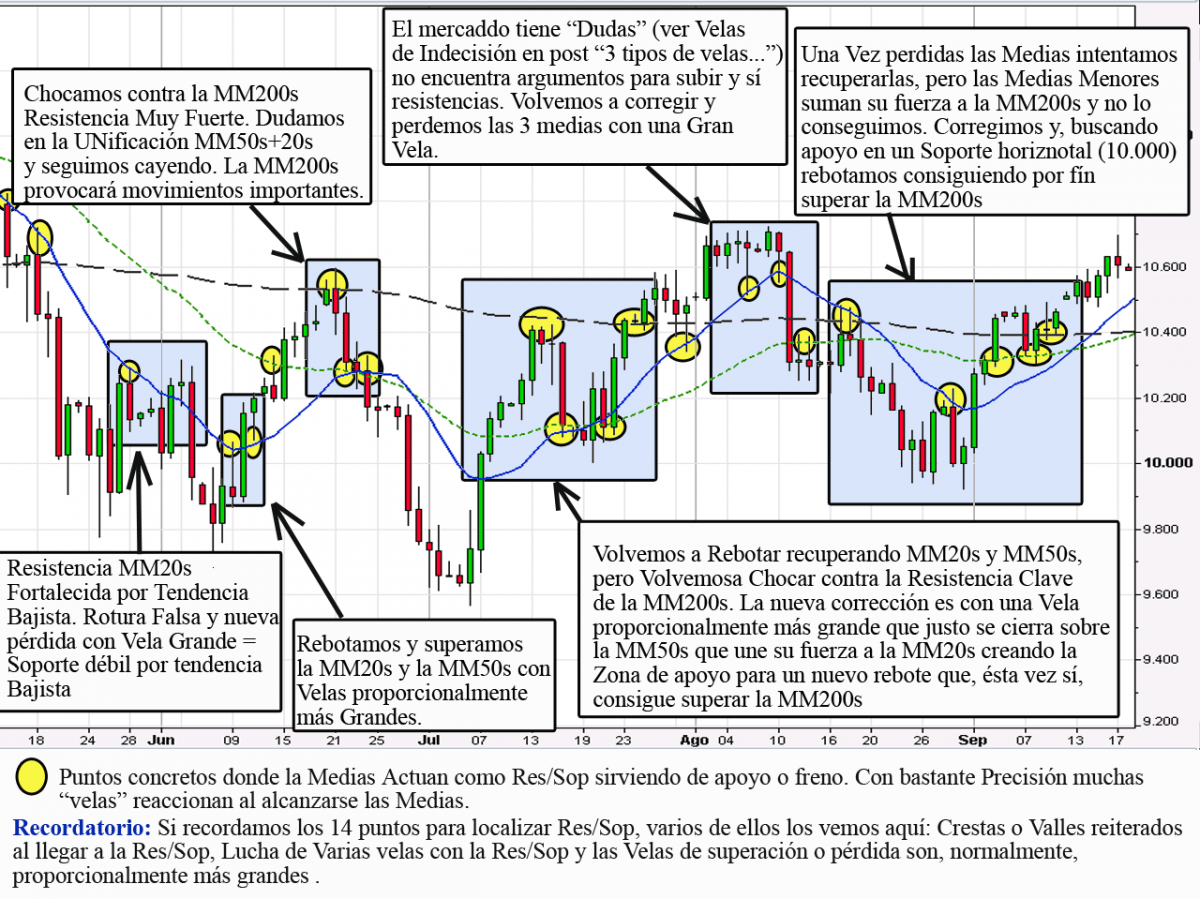 A las Medias de Longitud grande (Lentas) debemos considerarlas como Resistencias/Soportes Fuertes. Por ejemplo, la Media de 200s es un Sólido Soporte/Resistencia, siendo extraño que la rompamos a la primera, pero de hacerlo, los movimientos que se desencadenan suelen ser Señales Claras (bajistas o Alcistas) En cambio, una Media de 10 no tendrá demasiada solidez, por lo que su pérdida o superación, salvo circunstancias especiales, no serán argumentos de peso a tener en cuenta.