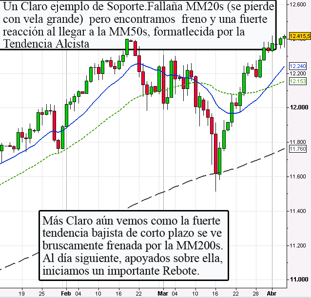 La MM20s, como vemos en el gráfico, irá “ceñida” a los precios. Dejará muy poco espacio al mercado (algo si deja) y los apoyos son muy frecuentes. Si la tendencia del mercado está clara, la MM20s es una guía muy útil para vigilar las posiciones. Sólo en tendencias muy definidas podemos tomar decisiones en base a éstas. La pérdida o superación de la MM20s no es un argumento demasiado importante, pero si nos deberá poner alerta. Podemos considéralo un “vigía” o Alarma. En circunstancias excepcionales (y algo frecuentes) Los precios se alejan mucho de las otras medias y de otras referencias, por lo que será entonces cuando la MM20s nos brindará una importante información pudiendo, incluso, tomar decisiones; pero insistir, mientras existan otras referencias cercanas, tomaremos a la MM20s como guía. Esto se debe a lo que hemos mencionado antes, si la tendencia es fuerte significará que la MM20s gana solidez (si estamos a favor), pero en circunstancias normales, fiarnos de la solidez de la MM20s nos traerá decepciones.