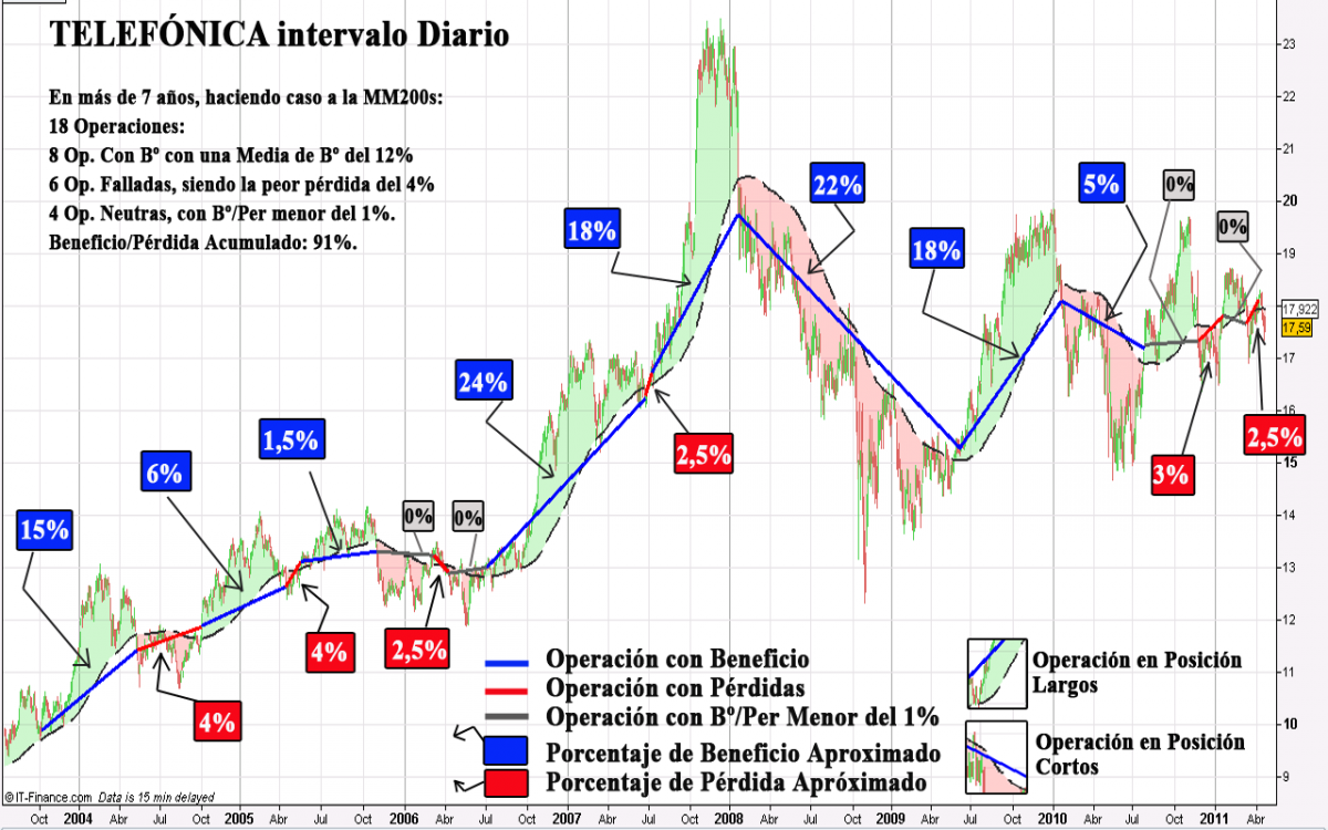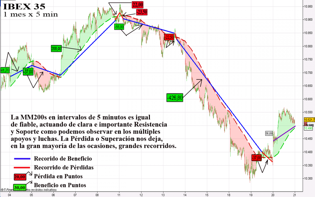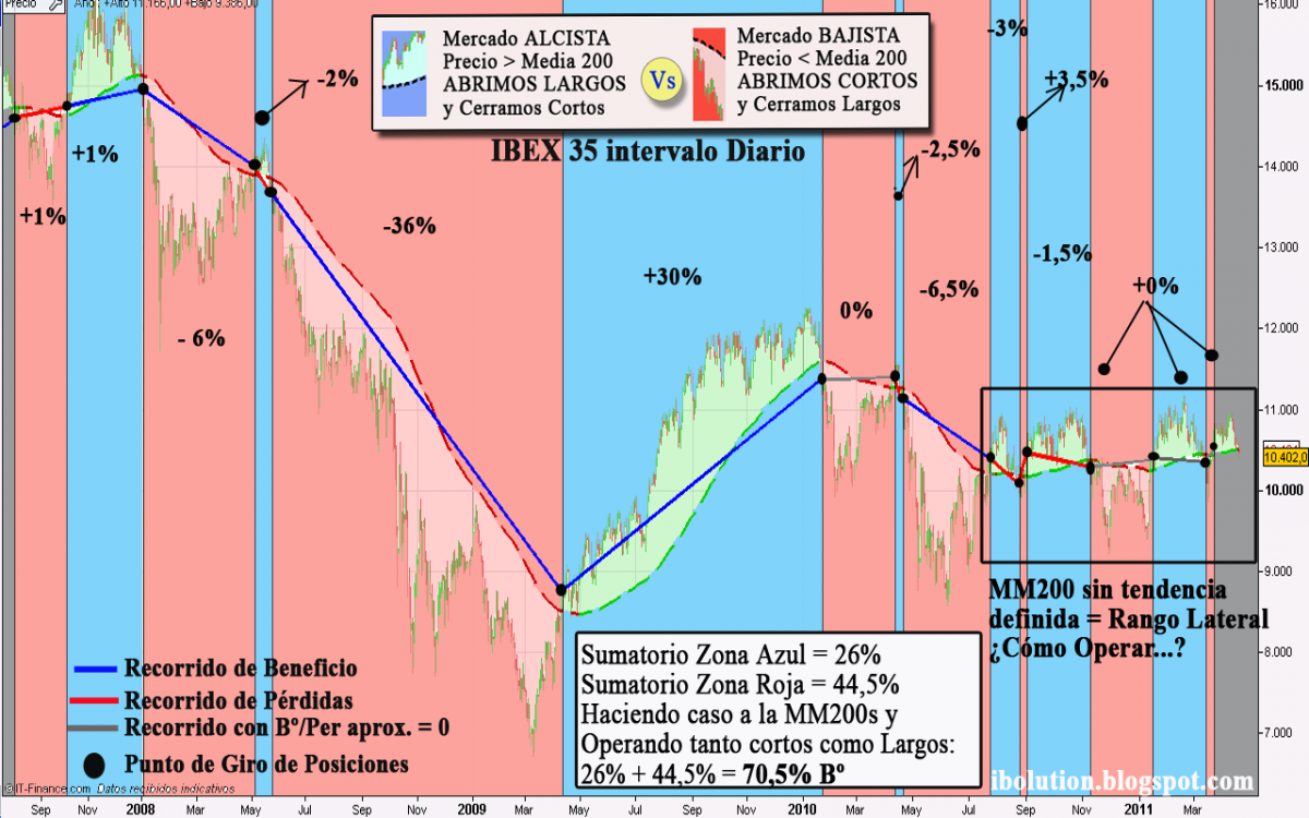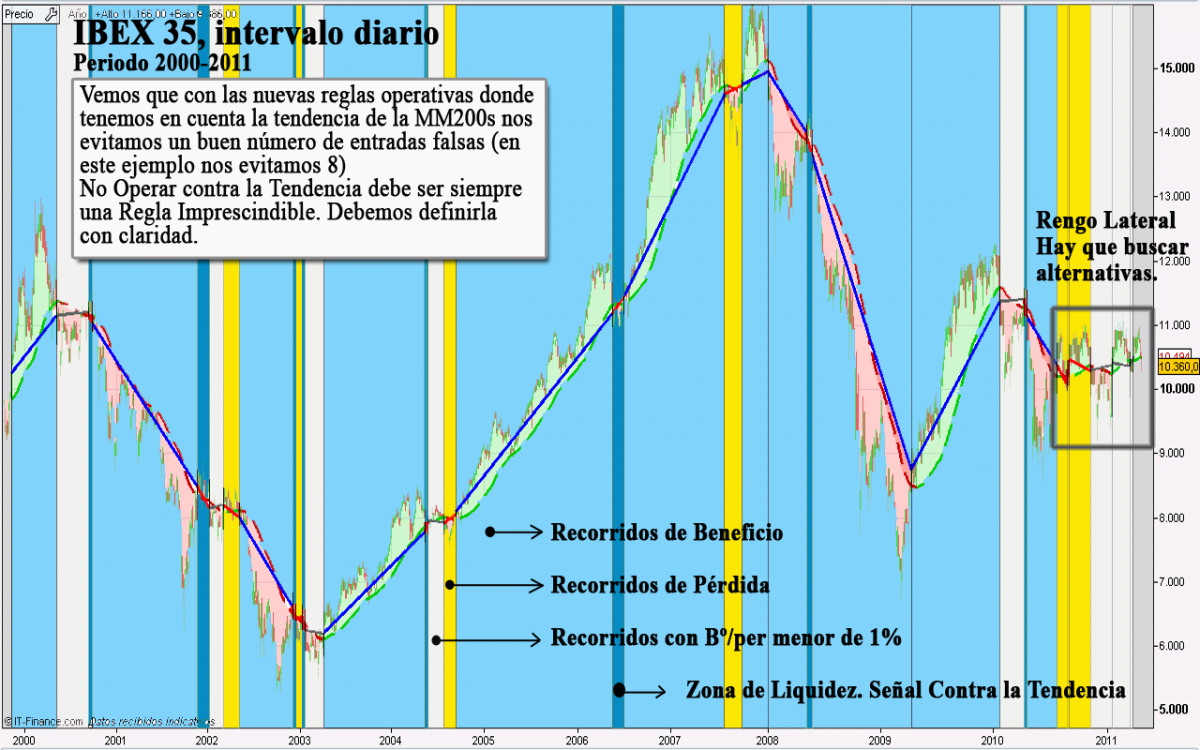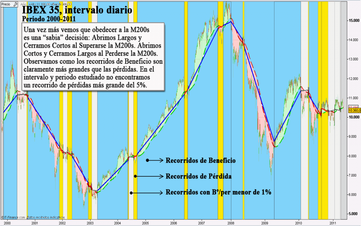 - Un Recorrido de Beneficio/Pérdida total menor del 1% se computará como 0%Es evidente que no puedo concretar. ¿Cuándo Entrar? ¿Cuánto esperar? ¿Dónde entrar? ¿Dónde colocar el Stop? Son preguntas que trataremos de responder en el futuro. Aún con todo, lo que se intenta transmitir con el ejemplo es que haciendo caso a la Media de 200 e insistiendo en el caso de encontrar entradas falsas, ésta termina cumpliendo y dejando recorridos más que suficientes para subsanar las pequeñas pérdidas debidas a entradas falsas.