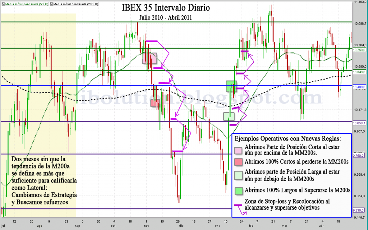 - Si venimos Largos y la M200s se pierde y permanecemos por debajo varios días, cerramos las posiciones Largas siempre. Pero si la tendencia de la M200s permanece claramente alcista no abriremos Cortos hasta que se debilite la tendencia. Si por el contrario, volvemos a superar la M200s, volveremos a abrir Largos, ya que entramos a favor.