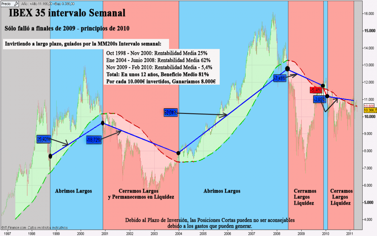 Entendiendo que muchos podemos pensar que los mercados en las fechas que estudiamos estuvieron sujetas a circunstancias especiales que pudieran invalidar el estudio, vamos a hacer el mismo ejercicio mostrando un gráfico que comprenda 10 años, periodo más que suficiente para demostrar la eficacia de la Media de 200s.