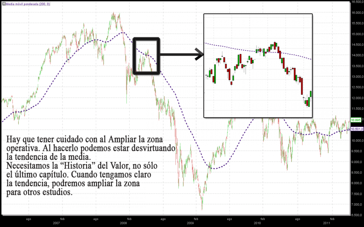 Y por último, como se dice, todo depende del prisma con que se mire: Definir la tendencia de la M200s (o de cualquier otra) depende de cómo nos mostremos los gráficos. Podemos ver una tendencia bastante definida y, al hacer zoom, percibir tal tendencia como muy débil e, incluso, interpretar, erróneamente, una tendencia lateral. Para evitar ésta confusiones, lo ideal es, una vez más, el sentido común. El análisis técnico no es más que el estudio de la Historia de un Valor y su proyección en el futuro, por lo tanto, sin llegar a ser extremistas, para definir la tendencia deberíamos tener un “buen trozo de historia” donde veamos los cambios de tendencia en la historia con claridad. Una vez definida, podemos hacer el zoon necesario para definir el punto de entrada, ganar precisión o analizar otros estudios. (pincha en la imagen para ver ejemplo en ventana nueva)