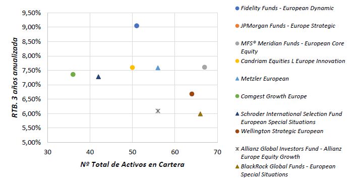 **Por aplicación visual del gráfico, el fondo JP Morgan Funds – Europe Strategic no se encuentra reflejado. Datos: Nº Total de Activos en Cartera: 292, RTB. 3 años anualizada: 8,17% y Alfa: 4,66. Fuente: Elaboración propia a partir de datos de Morningstar Direct (datos a 11/07/2018)