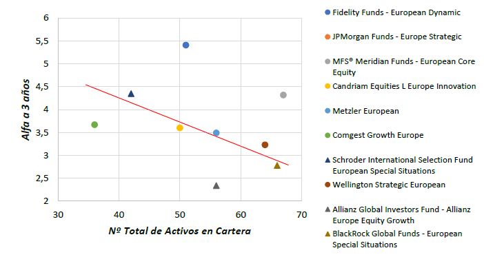 Al estudiar que ocurre con la generación de Alfa cuando aumenta el número de títulos en las carteras de fondos de inversión, observamos en el siguiente gráfico una relación negativa. Es decir, aumentar el número de activos genera una diminución de Alfa por parte del gestor.