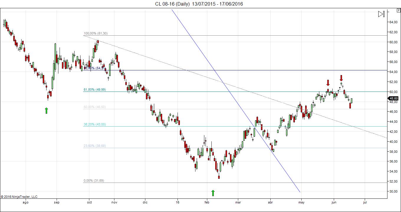 Por tanto el gráfico semanal nos indica que de la última caída ha tenido un retroceso que le llevo hasta los 50$ y que está tocando el fibonacci de 62 que puede hacer que vuelva a caer.