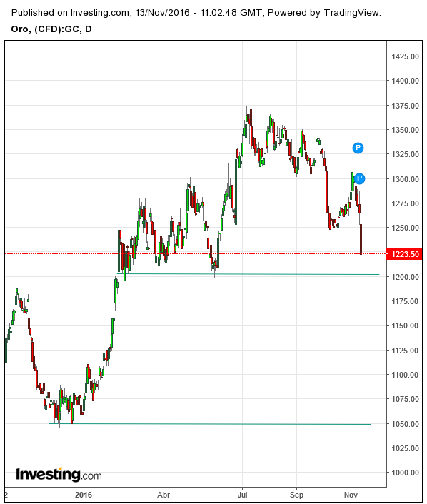 El oro ha dado un vuelco a todas las ideas que tenía. Movimiento brutal en caída que se acerca a la zona que toco en junio de este año que en caso de perder los 1200 abre la posibilidad de ir a los mínimos del 2015 y principios del 2016.