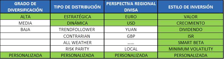Siguiendo mi hilo argumental, y una vez aceptado que distribuir una cartera implica una decisión, un gestor de carteras puede optar por diferentes estilos de distribución dentro de la gestión de carteras con instrumentos indexados, al menos con ETFs. Una de las razones por las que en inbestMe hemos decidido optar por construir carteras con ETFs es precisamente la versatilidad que éstos permiten, imposible de conseguir con fondos indexados (por su limitada oferta). Con ETFs se pueden llegar a construir carteras extremadamente diversificadas con activos indexados teniendo en cuenta, entre otros, los siguientes parámetros: