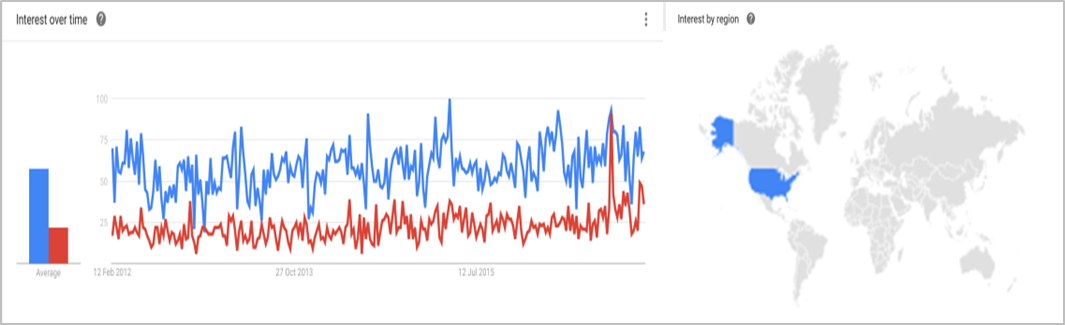 Mis reflexiones me han llevado a pensar que, aunque sí que existen activos indexados o pasivos, la gestión o inversión pasiva en realidad no existe. Por curiosidad he buscado en google hasta qué punto este es un término muy buscado: y sí, se puede confirmar que es creciente la búsqueda de gestión pasiva (“passive investing” en azul en el gráfico, en rojo “active investing”).