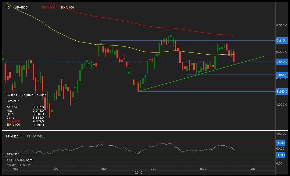 En apenas cinco sesiones, entre el día 24 y el 30 de mayo, el selectivo de la bolsa española se apuntó 500 puntos… pero cuando parecía que el asalto a los máximos anuales podía producirse, el anuncio de una fuerte ampliación de capital por parte del Banco Popular que devolvió a la dura realidad a la banca europea, y los renovados miedos al Brexit tras nuevas encuestas, han desactivado cualquier tipo de pronóstico de ataque a las resistencias a corto plazo.