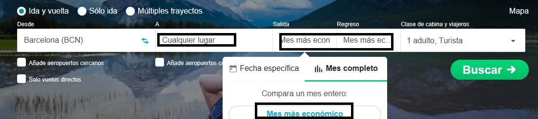 En aeropuerto de llegada ponemos cualquier lugar. En Fecha de Salida y Regreso ponemos MES MÁS ECONÓMICO.