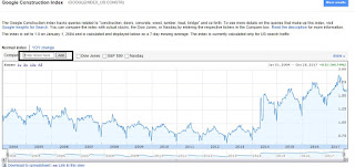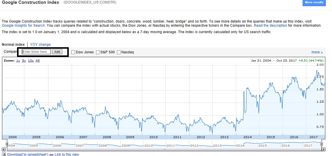 El índice de construcción de Google rastrea y refleja las consultas relacionadas con el sector de la Construcción. Con esta herramienta podemos comparar el índice con el Dow Jones o el NASDAQ o con alguna acción concreta, introduciendo los respectivos tickers en el cuadro de comparación que está marcado arriba en negrita.