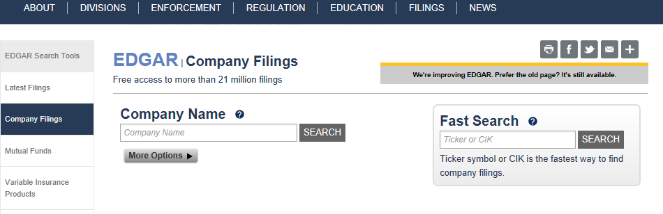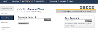 Esta sección contiene enlaces a los formularios e información sobre el sistema EDGAR de la SEC. Edgar es la base de datos de la SEC, que contiene los formularios presentados por las empresas que están obligadas por ley a cumplir con las regulaciones de la SEC. Las búsquedas de documentos presentados EDGAR se puede hacer ya sea a través de una búsqueda general o una búsqueda de texto completo en http://www.sec.gov/edgar/searchedgar/webusers.htm . La SEC proporciona un tutorial en EDGAR en http://www.sec.gov/edgar/quickedgar.htm .
