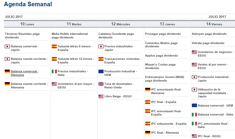 Aquí podemos encontrar los dividendos de las empresas que tenemos en cartera, producción industrial, inventarios, balanza comercial, IPC, peticiones de desempleo......