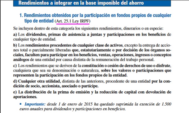 "Los dividendos y participaciones en beneficios obtenidos por la participación en los fondos propios de cualquier tipo de entidad estaban exentos con el límite de 1.500 euros anuales. Esta exención queda suprimida. (Se suprime la letra y) del artículo 7) de la LIRPF)."