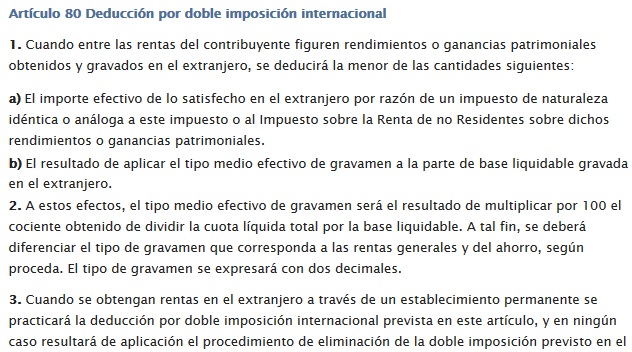 Si disponemos de acciones de empresas extranjeras que tengan su sede social fuera de España, los dividendos cobrados habrán sufrido una doble tributación, una de la hacienda de origen y otra en España. La ley del IRPF nos permite que efecuemos una deducción por doble imposición de acuerdo con lo dispuesto en el artículo 80 de la LEY IRPF