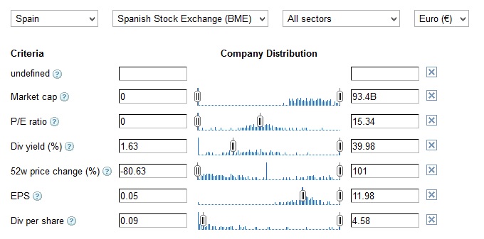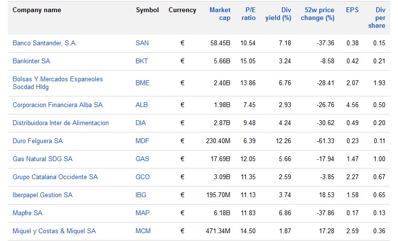 Decir que el resultado que nos ofrece la herramienta de Google Finance es un primer filtro que habría que completar. Si recordáis GRAHAM insistía que los beneficios fuesen estables y crecientes, aquí sólo aparecen los del último año. En cuanto a los dividendos hay que ver el historial, pero como primer filtro está bien.