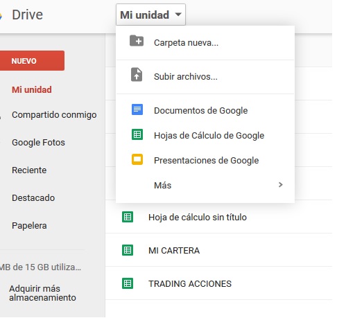 2.- El siguiente paso es abrir una hoja de Cálculo, para ello dentro de Google drive, clicamos en Mi unidad y le damos a Hoja de cálculo.