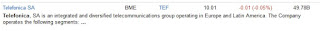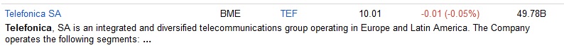 Por ejemplo telefónica vemos que pone TEF, para usar el ticker en la hoja de cálculo debemos ponerle .MC ( punto MC es para mercado español) al hacer esto debe ponerse en azul.