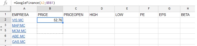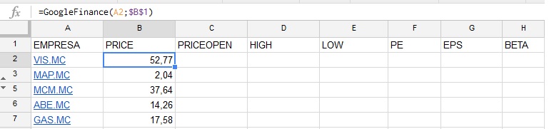 =GoogleFinance(A2;$B$1), siendo A2 "VIS.MC" y B1 "PRICE" el signo $ se pone para anclar PRICE, y para el que no comprenda que es anclar, es fijar esa celda para que se mantenga fija.