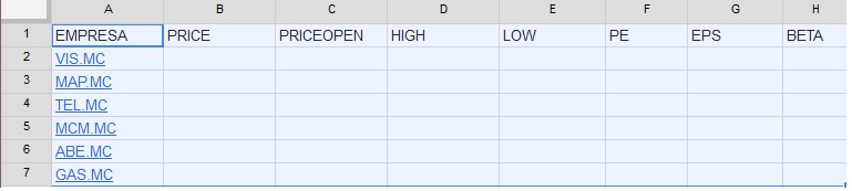 5. Una vez que hemos seleccionado las empresas, vamos a rellenar el resto de columnas, para ello vamos a utilizar la función =GoogleFinance("empresa","atributo")