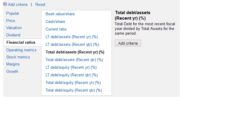 https://finance.google.com/finance?ei=6VCuWqLFHcGPUtKLg6gJ#stockscreener