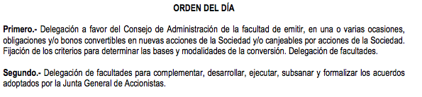 -Este octubre pasado se emitieron los famosos bonos al 11%, que no suscribió ni el tato, y se suspendió la emisión. Y solo tres meses más tarde se convoca Junta Extraordinaria de accionistas, en la que ahora me encuentro, para aprobar una nueva emisión de bonos, esta vez convertibles. Luego si en octubre fracasó estrepitosamente la emisión y se vuelve a optar por una nueva emisión, es porque Castillejo tiene un as en la manga, que nos va a contar en un momentito, y yo llamo corriendo a Selfbank y compro más acciones. Está claro.