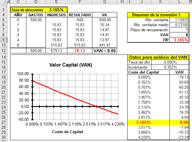 Aunque presenta algunos inconvenientes, si nos sirve para tener una comparación muy aproximada de las rentabilidades de distintos bonos. En el gráfico podemos observar como evoluciona el Valor Capital (VAN) de la inversión con los distintos costes de capital hasta hacerlo cero.