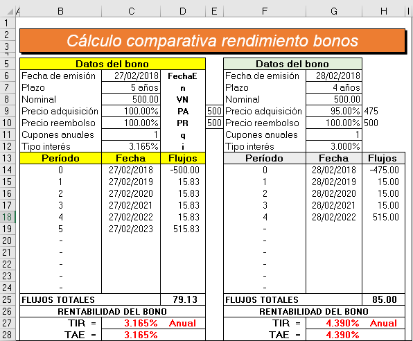 En el cuadro de la comparativa, observamos que un bono con un plazo de vencimiento menor (4 años) y un tipo de interés inferior (3,00%), obtiene una TIR superior (4,39%) al emitido a 5 años al tipo de interés del 3,165%, debido a la rentabilidad a vencimiento al encontrarse emitido con descuento.