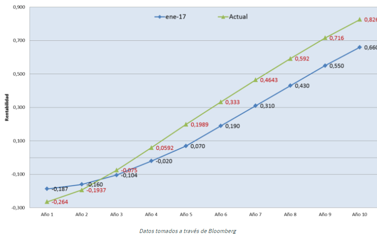 En los siguientes gráficos, observamos cómo se han comportado las curvas de tipos de interés hasta el plazo de 10 años, en enero 2017 y la curva actual y los tipos a 3 años desde julio pasado junto a las rentabilidades actuales.
