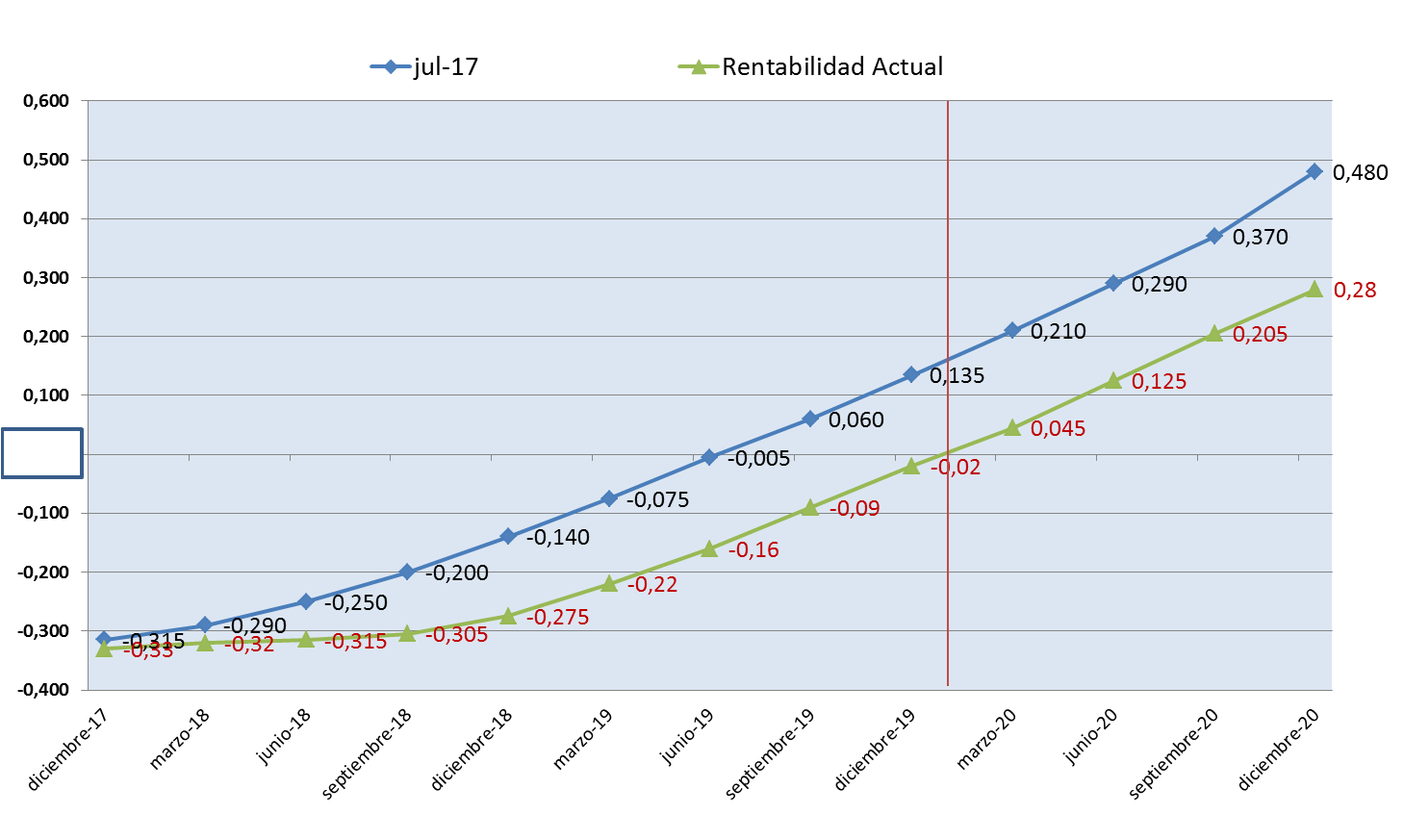 A primera vista, observamos que la previsión es que hasta el año 2020 no veremos las tan comentadas subidas de tipos de interés. Que coincide con las declaraciones efectuadas por Mario Draghi en cuanto a la política monetaria del BCE con la reducción de compra de bonos hasta el próximo septiembre-2018 (algunos analistas piensan que será hasta finales de año) y que mantendría los tipos próximos a cero durante un período largo de tiempo.
