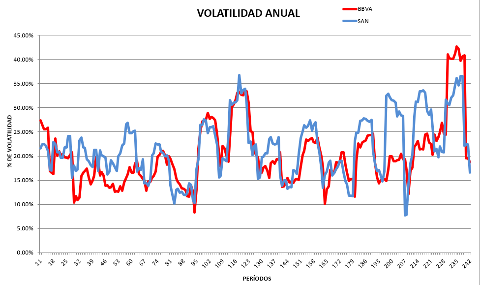 Uno de los principales riesgos, es la volatilidad. La volatilidad, en este caso, es la variabilidad del precio de las acciones respecto a su precio medio histórico. Es la rapidez con la que cambian los precios y la intensidad de esos cambios con respecto al mercado. Por lo tanto, se trata de la primera medida de riesgo que debemos conocer. Si bien, la volatilidad mide el comportamiento pasado, no podría significar un riesgo futuro, pero si que nos aporta una probabilidad de riesgo futuro. Un alto grado de volatilidad supondría un mayor riesgo, tanto en las fluctuaciones de los valores bursátiles como en la liquidez de las acciones.