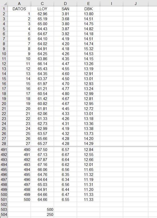 Para nuestro ejemplo, partiremos de una hoja de Excel con unos datos mínimos. Importamos las cotizaciones del histórico diario, precio de cierre de los valores que queremos analizar, supongamos que queremos invertir en banca. Yo utilizo https://finance.yahoo.com/. En el ejemplo, analizo tres valores del sector bancario (Lloyds Bank, Santander y Deutsche Bank), cotizaciones de los dos últimos años bursátiles (500 cotizaciones) que quedan en la columna C, D y E de la hoja.