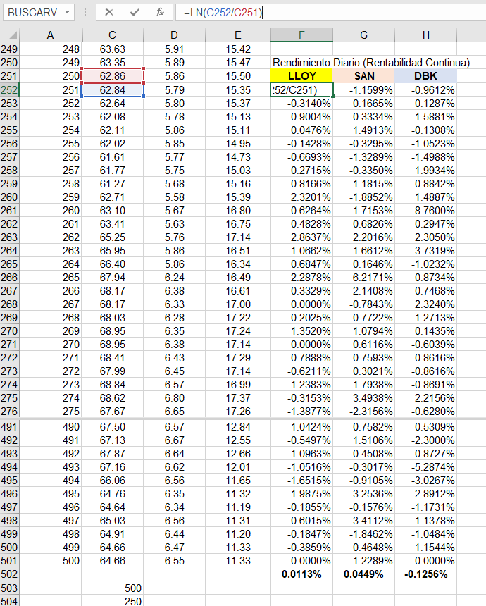 En las columnas F, G y H, calculo el rendimiento diario (variación del precio y sin dividendos), en este ejemplo, del último año bursátil (Rentabilidad Continua de las últimas 250 cotizaciones). Este cálculo lo realizo mediante la fórmula de Logaritmo Neperiano del cociente entre el precio de cierre del día dividido por el precio del cierre del día anterior, tal y como se ve en la imagen.