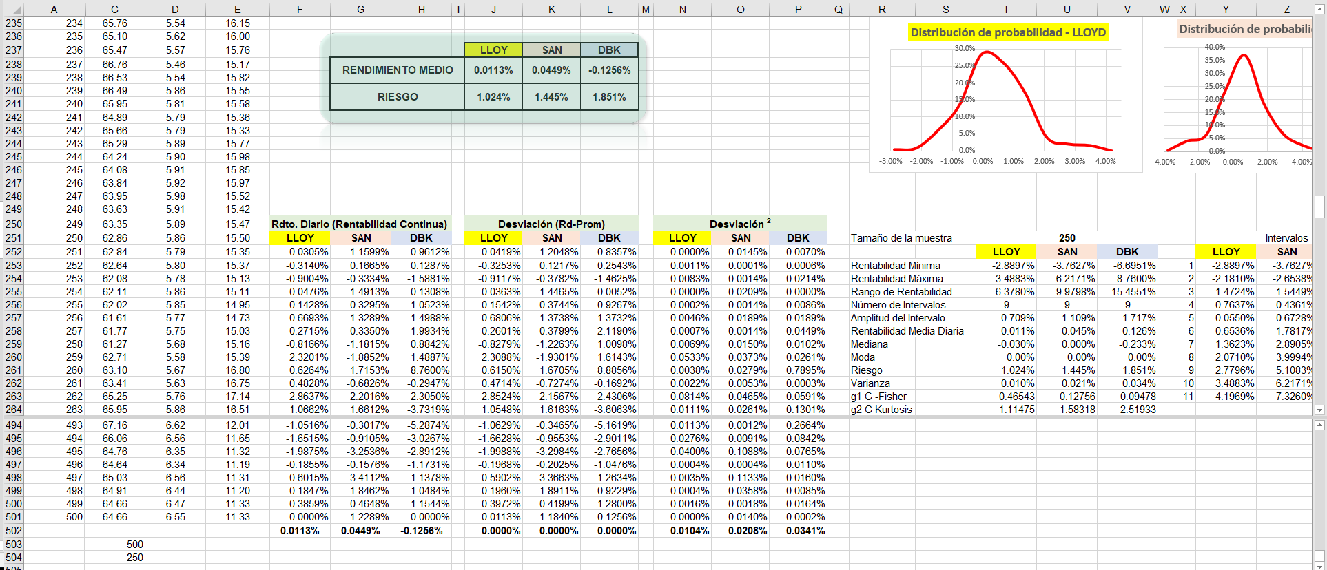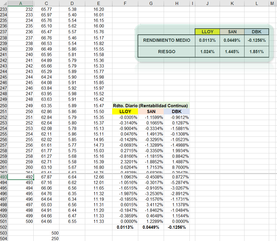En la fila 502, vemos la rentabilidad media, calculada con la fórmula del Promedio del rango de los 250 valores de cada columna. Este dato, sería una aproximación a lo que puede ser la rentabilidad esperada (sin dividendos). Pero necesita una mayor aclaración, ya que no es del todo cierto, pues la mayoría de los días, la rentabilidad no se aproxima a ese valor.