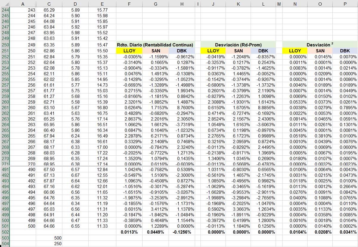 Si asociamos el riesgo al hecho de que un precio se aleje más o menos de su promedio, podemos calcular las desviaciones diarias de los precios con respecto a su media (Columnas J,K y L). Pero su promedio, lógicamente no nos cuantificará el riesgo, porque las desviaciones positivas anulan las desviaciones negativas y su promedio es cero, resultado que volvemos a ver en la fila 502.