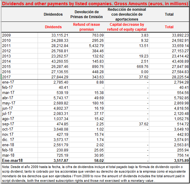 Las cotizadas repartieron entre los accionistas, 28.225 millones de euros en dividendos, devolución de aportaciones por primas de emisión y reducciones de nominal, La rentabilidad por dividendo de la Bolsa española es uno de los primeros entre los mercados bursátiles con un 4,1% según datos del MSCI Blue Book.