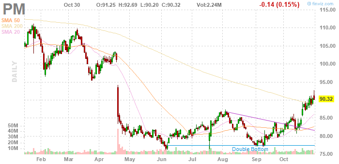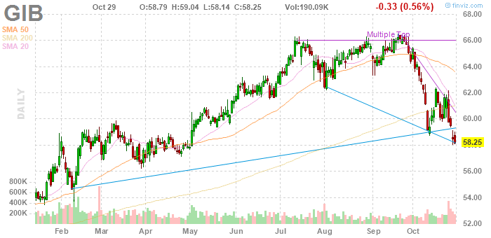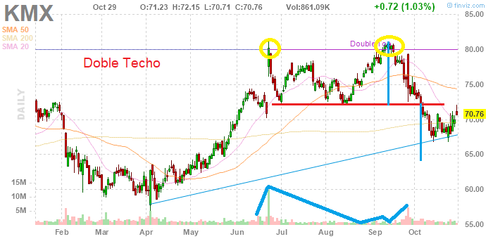 En el gráfico anterior, vemos un doble techo formado este año en CarMax, Inc., en el entorno de los 80$, observamos la formación del primer techo a finales de Junio con importante incremento de volumen y el segundo techo, con menor volumen a primeros de Septiembre, rompiendo el soporte en Octubre, con incremento de volumen, esperando que confirme figura con la formación de Pull-Back a finales de este mes.